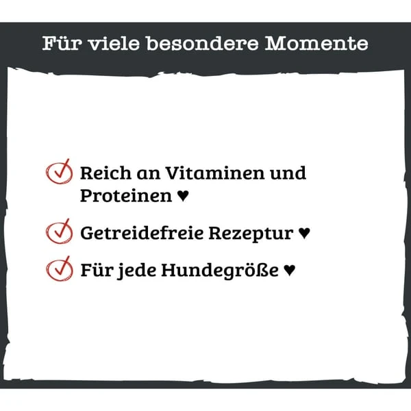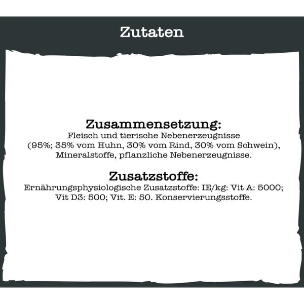 Fleisch und tierische Nebenerzeugnisse (95%; 35% vom Huhn, 30% vom Rind, 30% vom Schwein), Mineralstoffe, Pflanzliche Nebenerzeugnisse.
