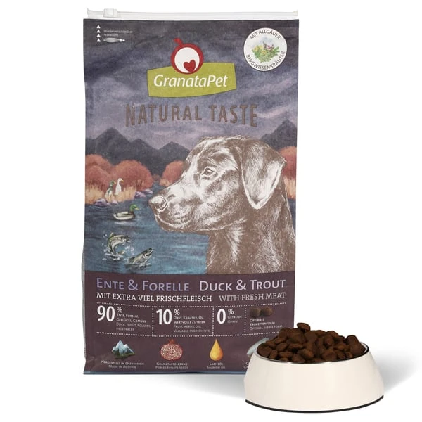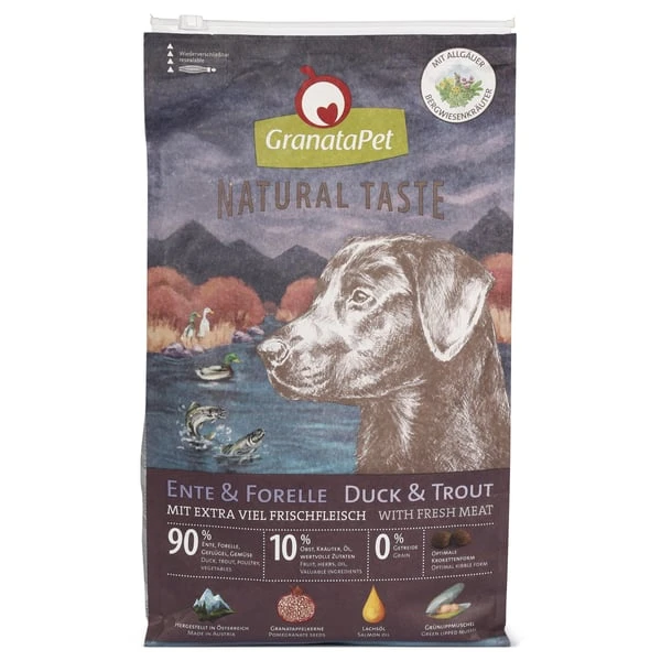 Ente, Forelle und Geflügel 70 % (frisches Entenfleisch 20 %, frische Forelle 15 %, frisches Geflügelfleisch 15 %, Entenfleisch getrocknet und fein vermahlen 5 %, Forelle getrocknet und fein vermahlen 5 %, Geflügelfleisch getrocknet und fein vermahlen 5 %, Geflügelfett 5 %), Gemüse 20 % (Kartoffelflocken, Spinat, Karotten), Granatapfelkerne 4 % (getrocknet und fein vermahlen), Lachsöl 2 %, Mineralstoffe 1,5 %, Vitamine 0,5 %, Allgäuer Bergwiesenkräuter 0,5 % (Bockshornklee, Breitwegerich, Spitzwegerich, Kamille, Löwenzahn, Ringelblume), Chicoree 0,5 % (fein vermahlen, mit natürlichen FOS und Inulin), Kräuter 0,3 % (Pfefferminze, Thymian, Oregano, Salbei, Petersilie, Majoran, Anissamen), Früchte 0,3 % (Cranberrys, Heidelbeeren, Äpfel), Algen 0,2 % (Spirulina, Knotentang), neuseeländische Grünlippmuschel 0,1 % (fein vermahlen, von Natur aus reich an Glucosamin und Chondroitin), Yucca schidigera 0,1 %