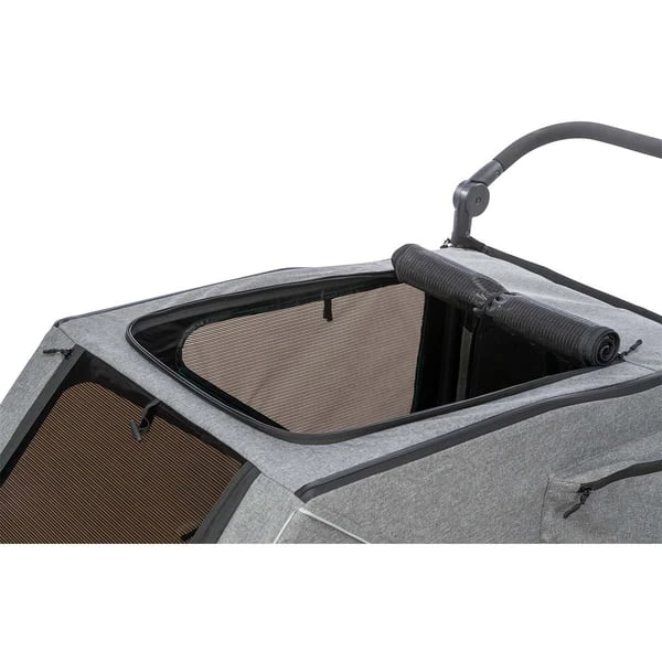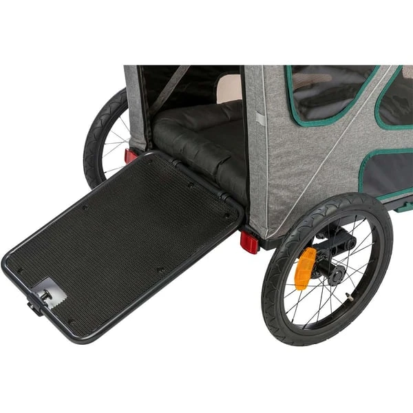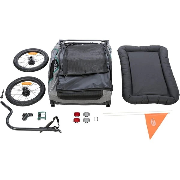 Der Trixie Fahrrad-Anhänger ist ein sicherer und bequemer Weg, deinen Vierbeiner mit auf Radtouren zu nehmen. Der Anhänger ist aus robustem Metall gefertigt und hat eine grau-grüne Farbkombination. Dein Liebling kann es sich auf der großen Liegefläche gemütlich machen und die Fahrt genießen. Das praktische Regenverdeck schützt dabei vor unerwarteten Wetterumschwüngen.